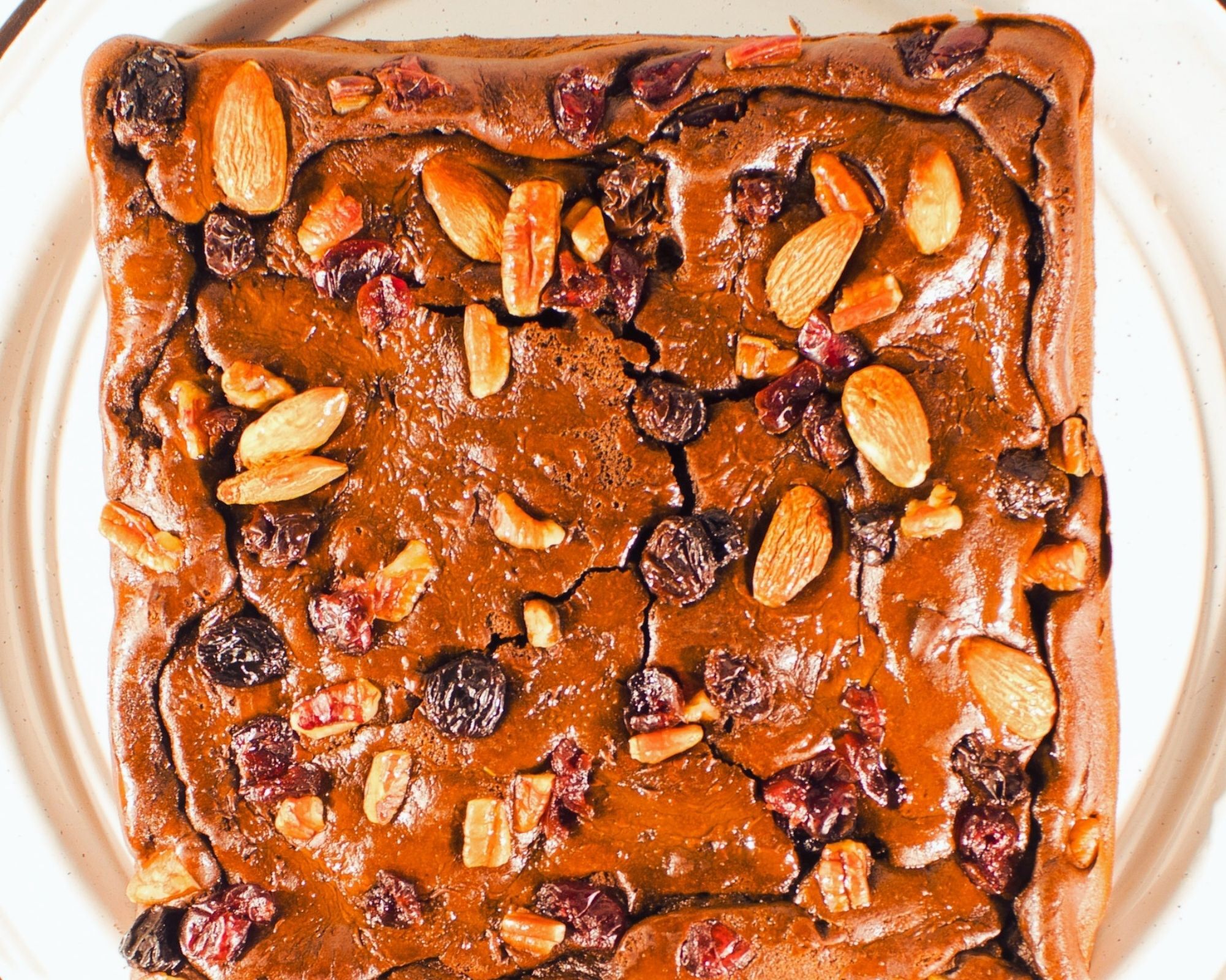 aunque se hornea de forma tradicional, nos hemos esforzado en que sus ingredientes te den el balance para tu ingesta calórica correcta. este bizcocho de chocolate con frutos secos, contiene chocolate (70% cacao), huevo, nuez, arándano rojo, harina de amaranto, esencia de vainilla, pasas, aceite de coco, stevia, leche de coco, harina de arroz, almendra.