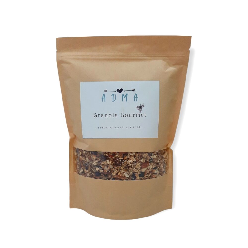 Granola Gourmet hecha con productos de gran calidad a base de avena y cereales como quinoa, amaranto, semillas de pepitas de calabaza, de girasol, bayas de goji, arándanos azules, chía y linaza, nueces pecanas, de macadamia, de castilla y endulzada con miel 100% de abeja, la cual aporta gran cantidad de vitaminas y minerales y ácidos grasos esenciales para el buen funcionamiento de nuestro sistema nervioso, su gran contenido de fibra ayuda a mejorar nuestra digestión. Aliméntate de manera saludable comiendo de manera rica y practica.