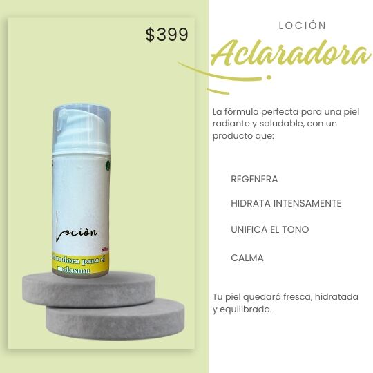 Nuestra loción aclaradora para melasma está formulada con ingredientes naturales que ayudan a reducir la producción de melanina, el pigmento que da color a la piel. Estos ingredientes incluyen:
