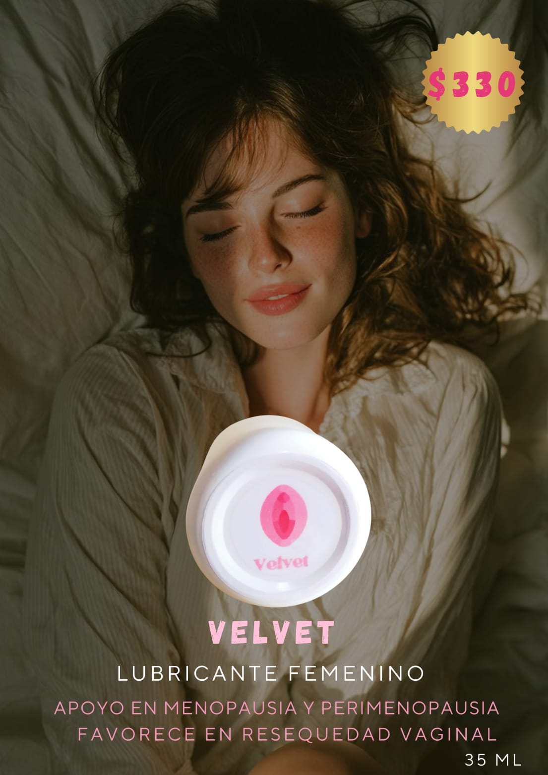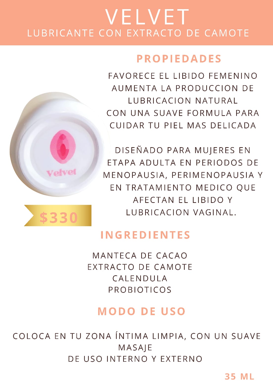 Velvet contiene extracto de camote, caléndula, probióticos y manteca de cacao para aumentar la lubricación, cuidar la flora vaginal y favorecer el bienestar íntimo, especialmente en etapas de menopausia o tratamientos médicos.