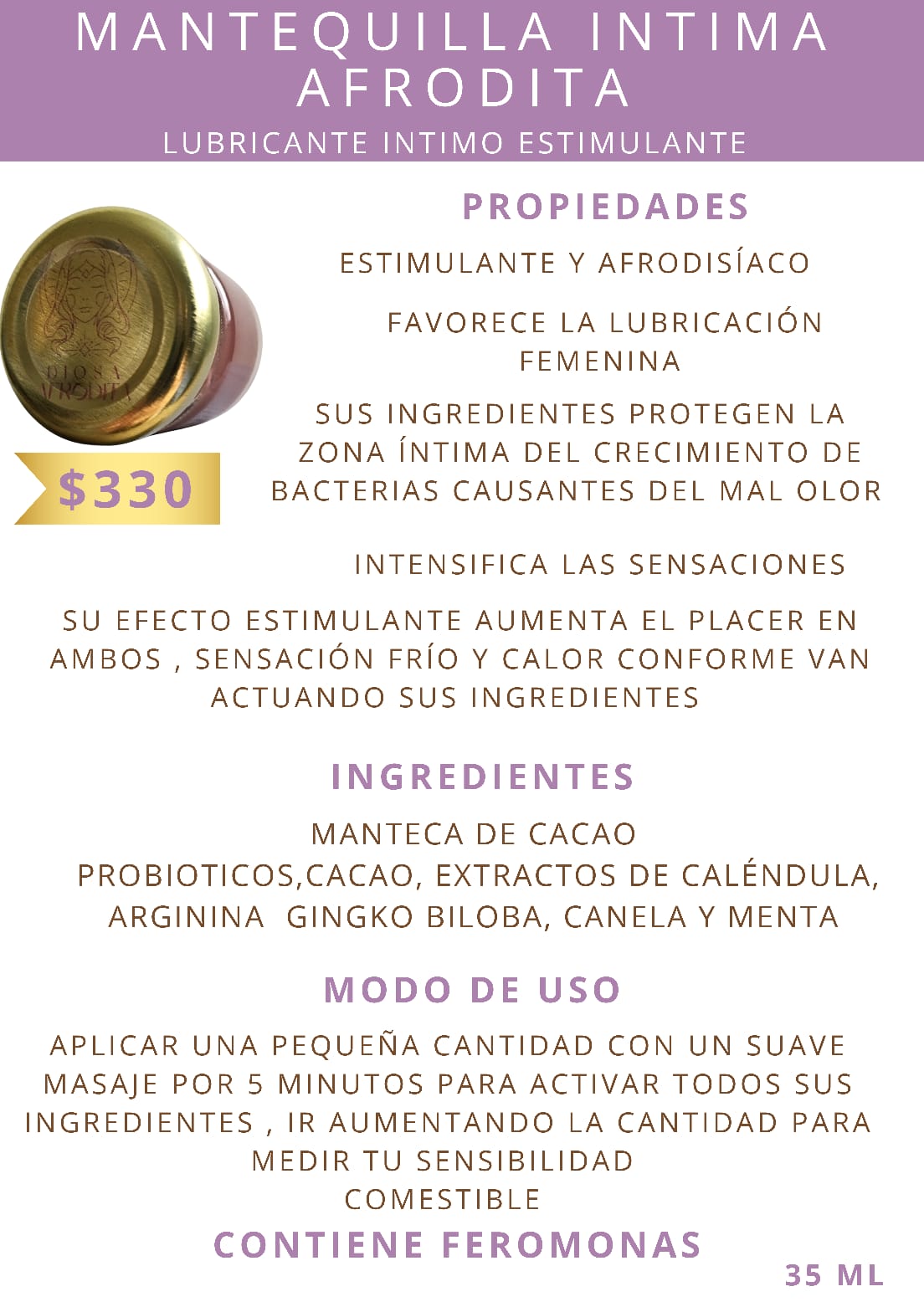 Una mantequilla íntima deliciosa, cálida y afrodisíaca que intensifica el placer y favorece tu lubricación natural. ¡Un must sensual!