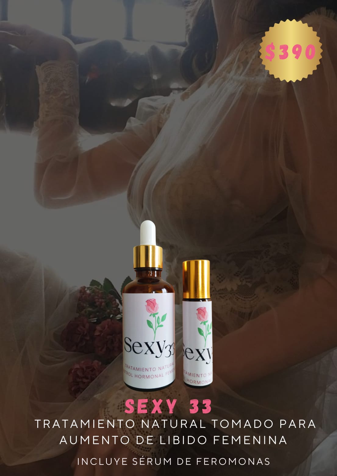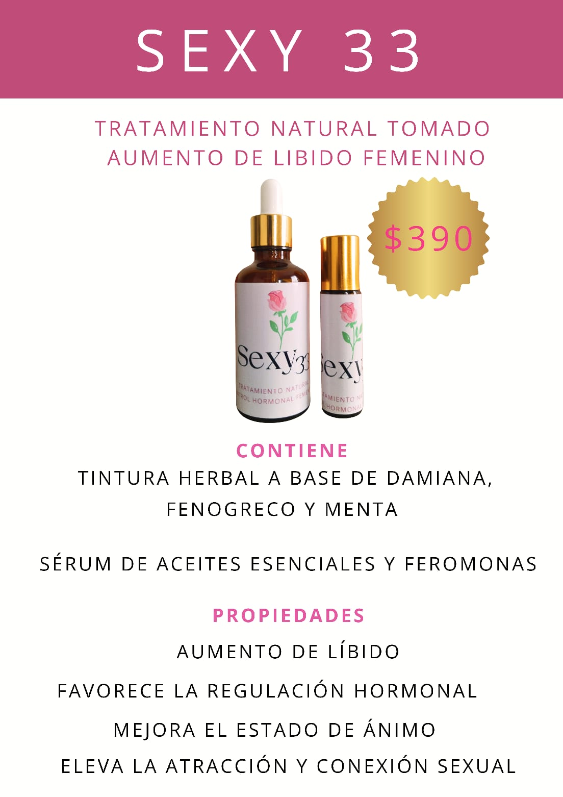 Sexy 33 es un tratamiento diseñado para apoyar el sistema hormonal femenino. Ayuda en etapas de bajo deseo sexual, cambios de humor, bochornos, desbalances hormonales y síntomas de menopausia o perimenopausia.